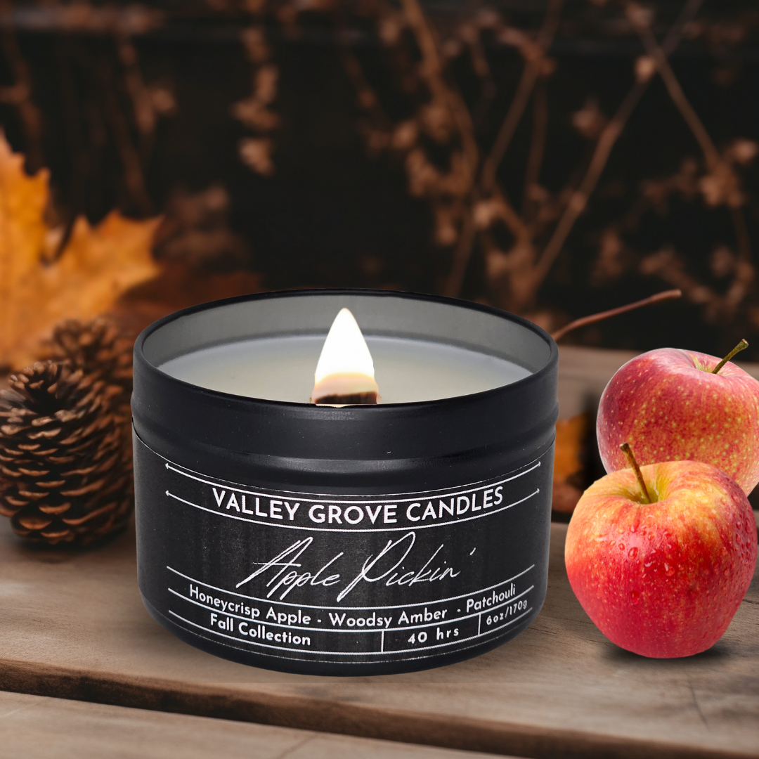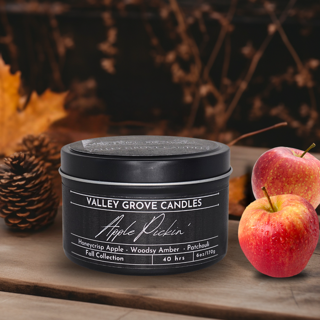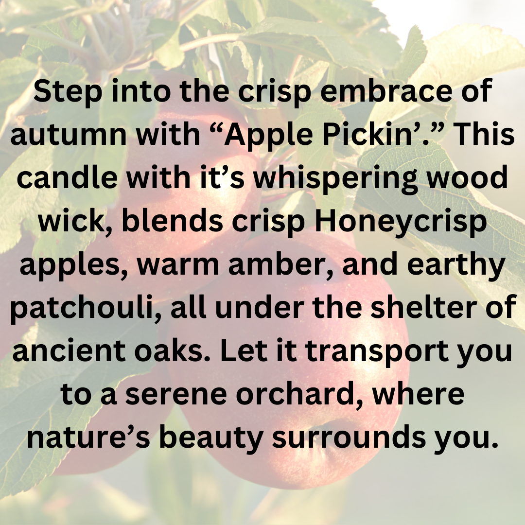 Step into the crisp embrace of autumn with “Apple Pickin’.” This candle, with it's whispering wood wick, blends crisp Honeycrisp apples, warm amber, and earthy patchouli, all under the shelter of ancient oaks. Let it transport you to a serene orchard, where nature’s beauty surrounds you.