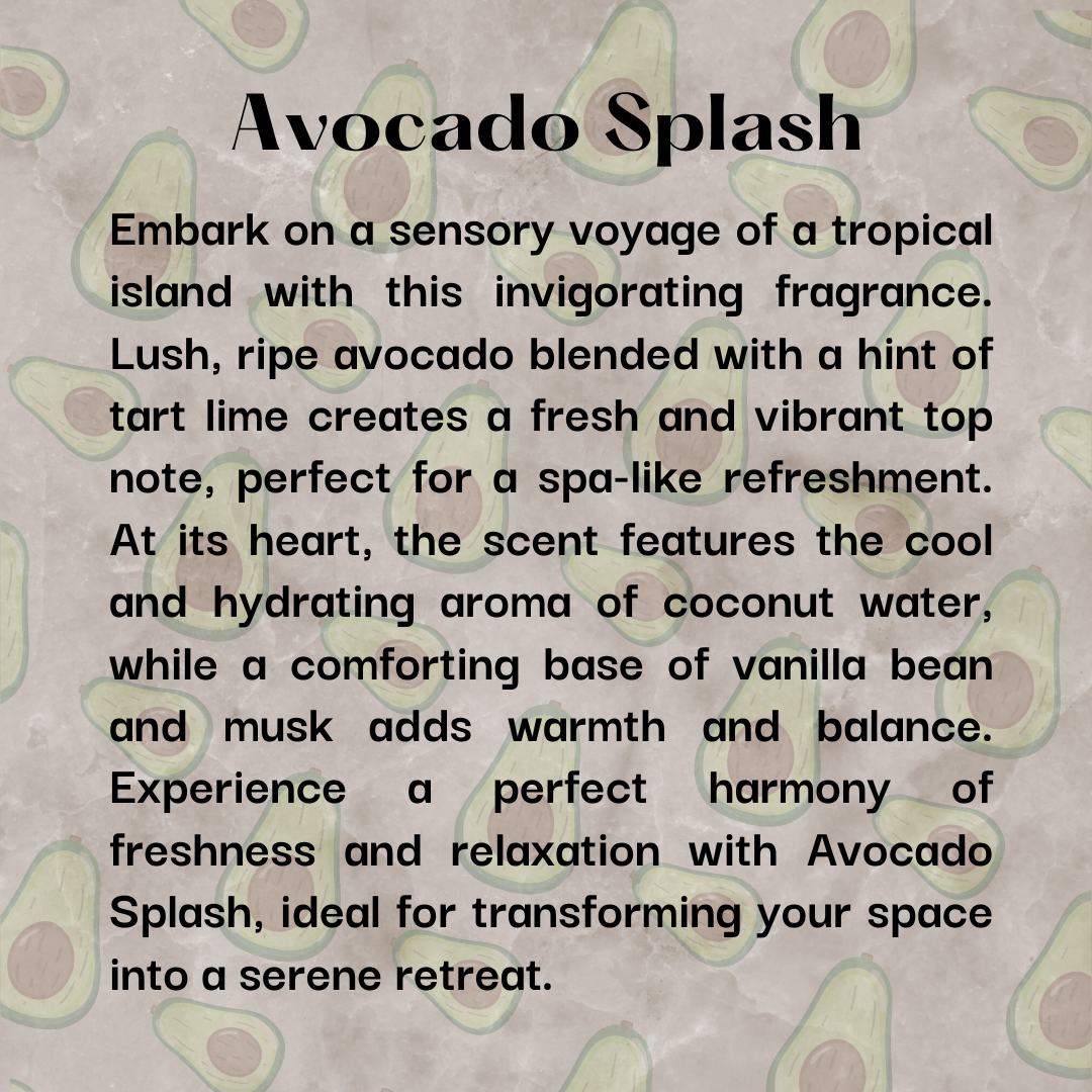 Embark on a sensory voyage of a tropical island with this invigorating fragrance. Lush, ripe avocado blended with a hint of tart lime creates a fresh and vibrant top note, perfect for a spa-like refreshment. At its heart, the scent features the cool and hydrating aroma of coconut water, while a comforting base of vanilla bean and musk adds warmth and balance. Experience a perfect harmony of freshness and relaxation with Avocado Splash, ideal for transforming your space into a serene retreat.