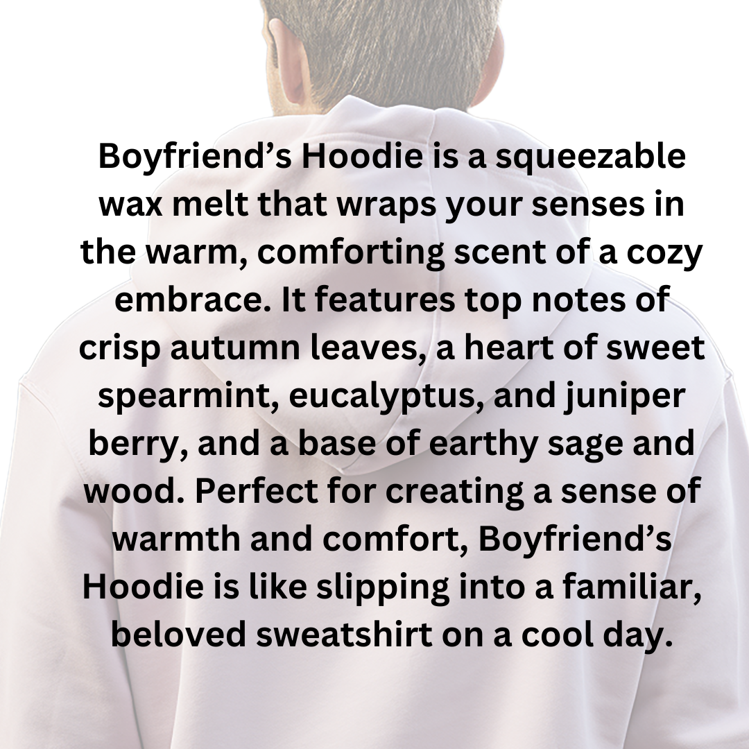 Boyfriend’s Hoodie is a squeezable wax melt that wraps your senses in the warm, comforting scent of a cozy embrace. It features top notes of crisp autumn leaves, a heart of sweet spearmint, eucalyptus, and juniper berry, and a base of earthy sage and wood. Perfect for creating a sense of warmth and comfort, Boyfriend’s Hoodie is like slipping into a familiar, beloved sweatshirt on a cool day.