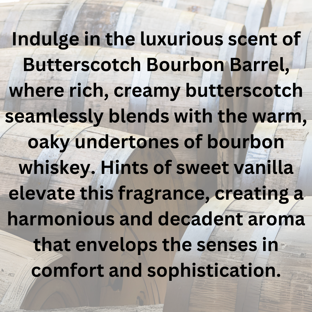 Indulge in the luxurious scent of Butterscotch Bourbon Barrel, where rich, creamy butterscotch seamlessly blends with the warm, oaky undertones of bourbon whiskey. Hints of sweet vanilla elevate this fragrance, creating a harmonious and decadent aroma that envelops the senses in comfort and sophistication.