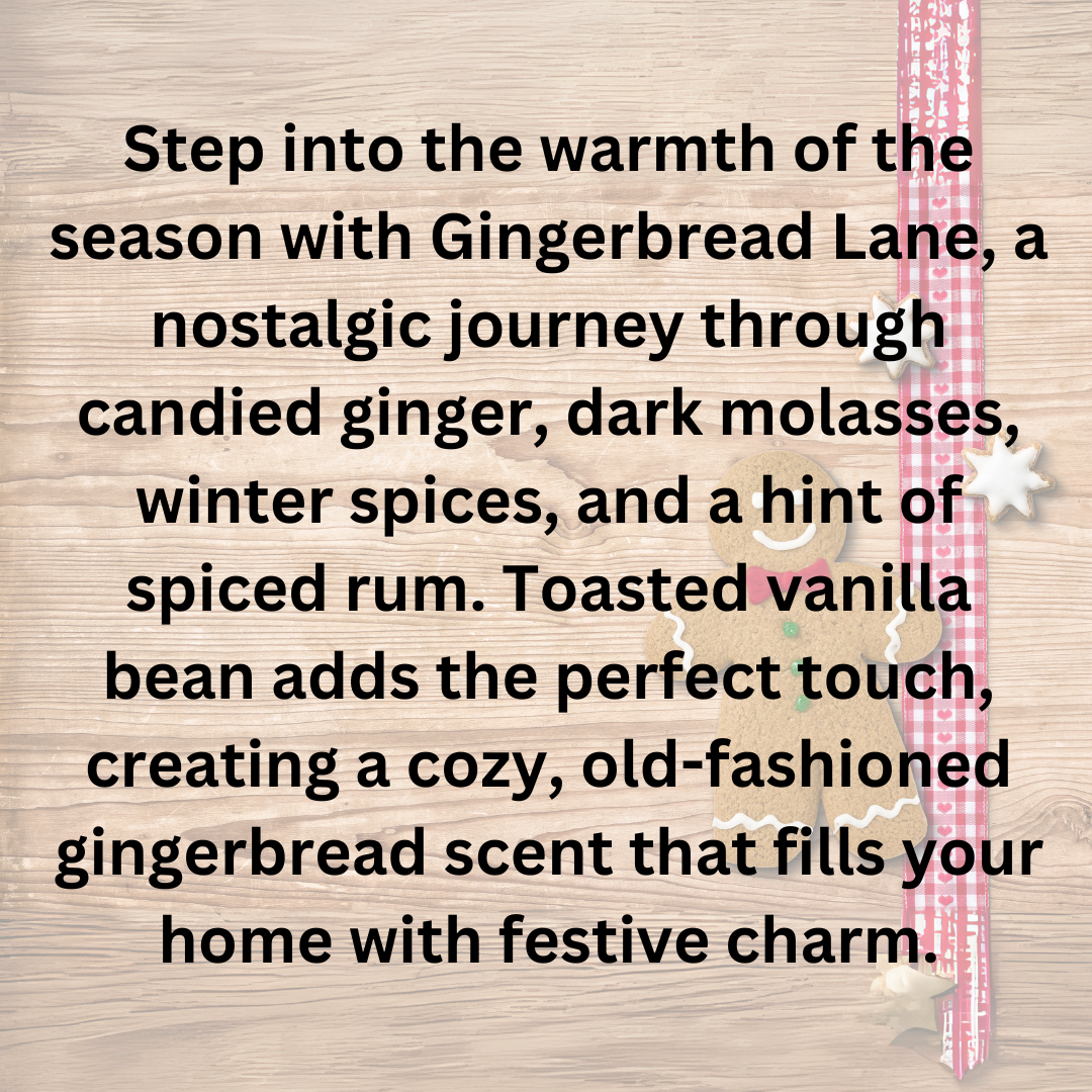 Step into the warmth of the season with Gingerbread Lane, a nostalgic journey through candied ginger, dark molasses, winter spices, and a hint of spiced rum. Toasted vanilla bean adds the perfect touch, creating a cozy, old-fashioned gingerbread scent that fills your home with festive charm.