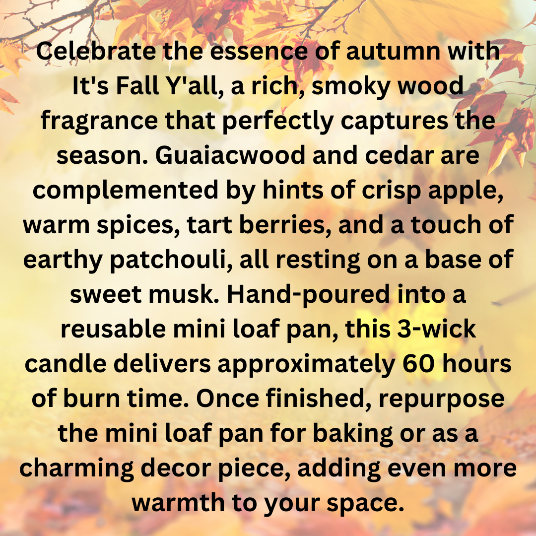 Celebrate the essence of autumn with It's Fall Y'all, a rich, smoky wood fragrance that perfectly captures the season. Guaiacwood and cedar are complemented by hints of crisp apple, warm spices, tart berries, and a touch of earthy patchouli, all resting on a base of sweet musk. Hand-poured into a reusable mini loaf pan, this 3-wick candle delivers approximately 60 hours of burn time. Once finished, repurpose the mini loaf pan for baking or as a charming decor piece, adding even more warmth to your space.