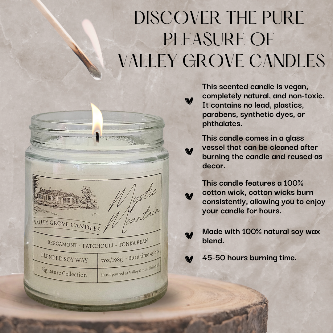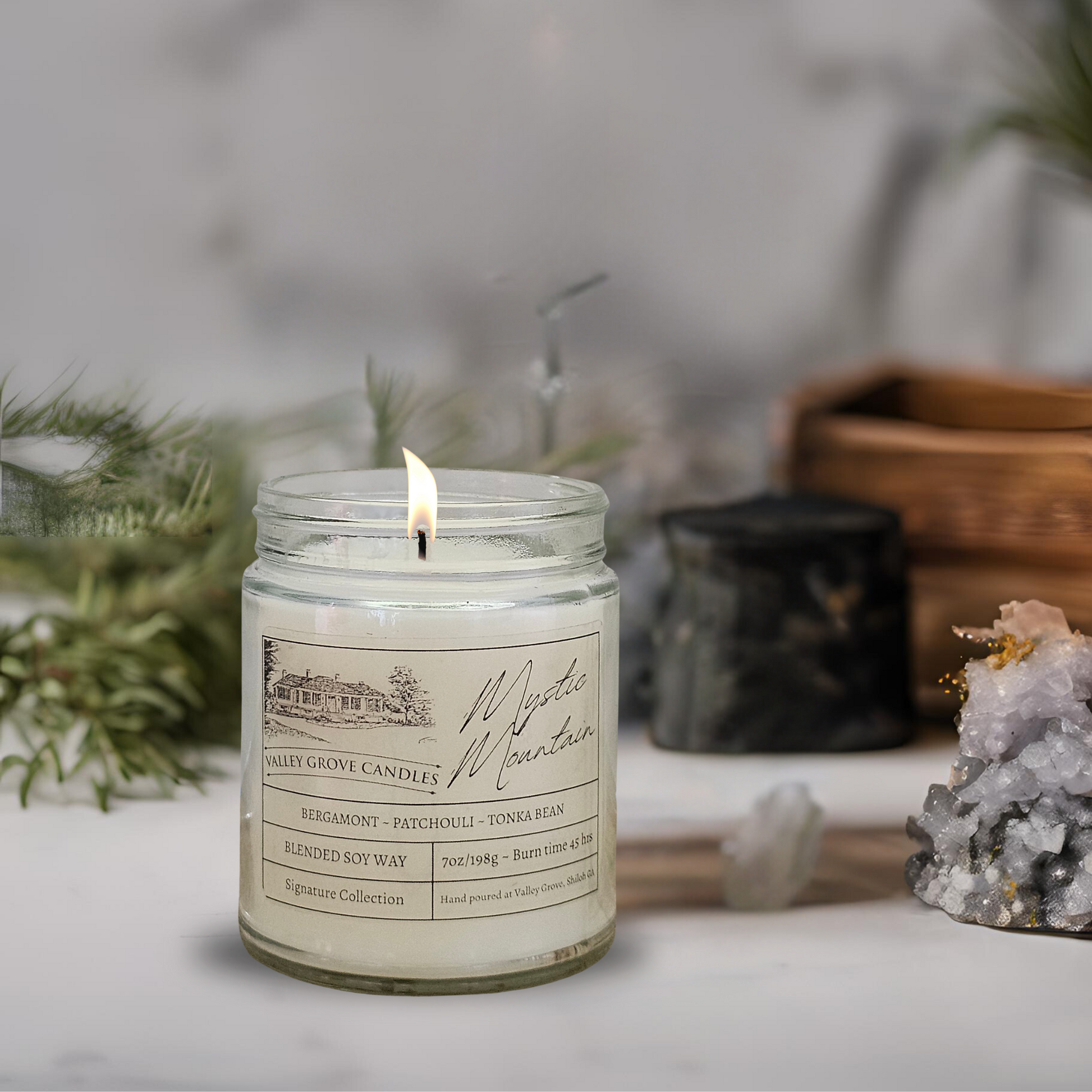 Embark on an enchanting journey with Mystic Mountain. The captivating candle blends vibrant top notes of Bergamot, Orange, and Lemon, awakening your senses with a burst of citrus freshness. As the initial zest fades the heart of the fragrance reveals a floral symphony of Geranium, Lily, and Rose transporting you to a serene mountaintop garden. Finally, the scent settles into a warm and grounding base of Patchouli, Vetiver, and Tonka Beans, evoking the mystical allure of a hidden mountain retreat. Light Mystic Mountain to elevate your space and experience the magic of nature’s finest aromas.