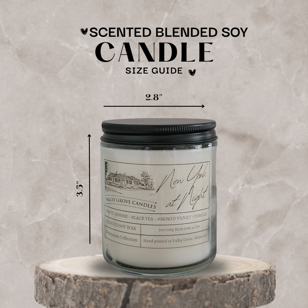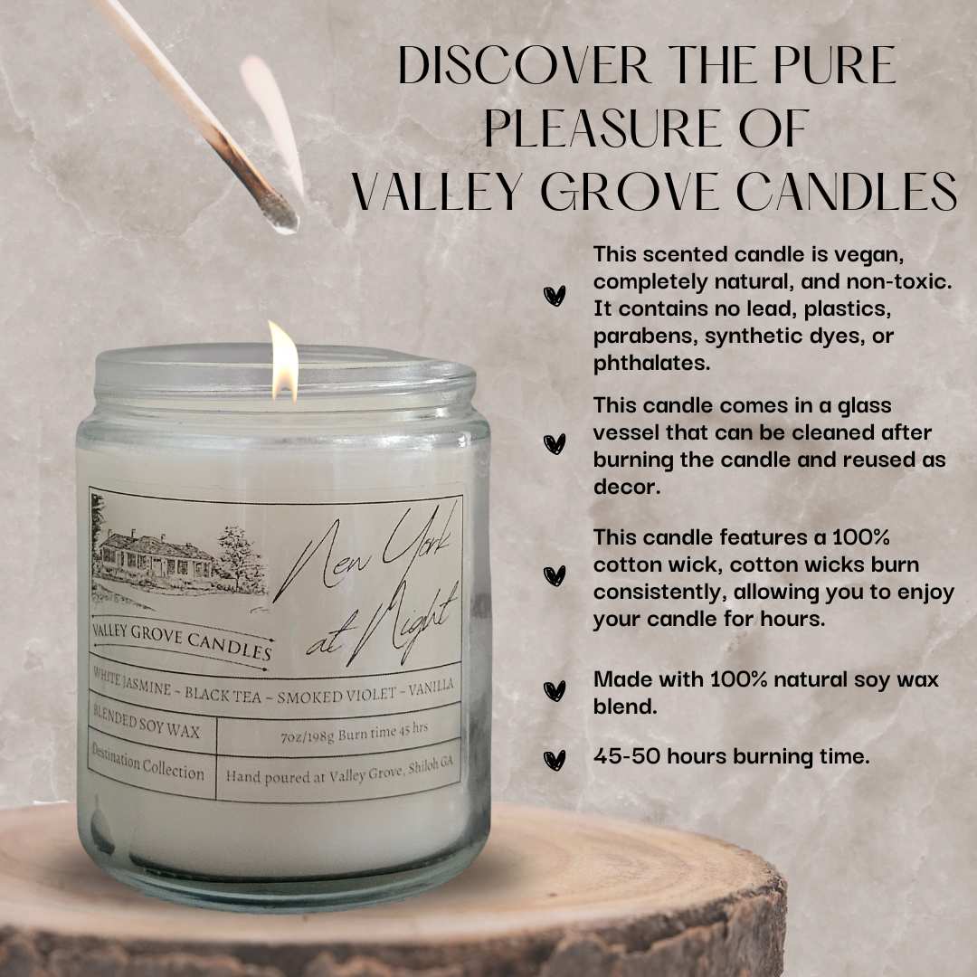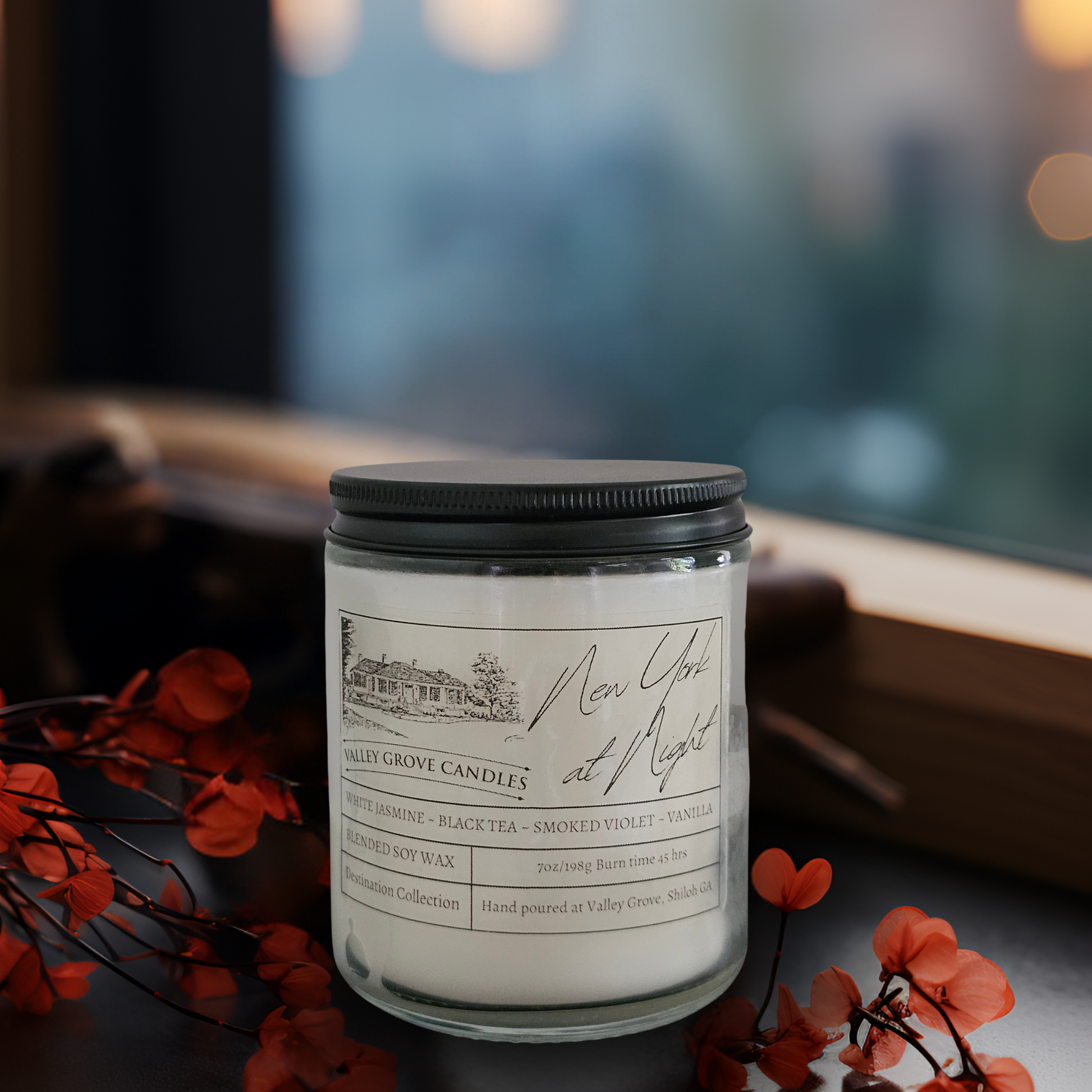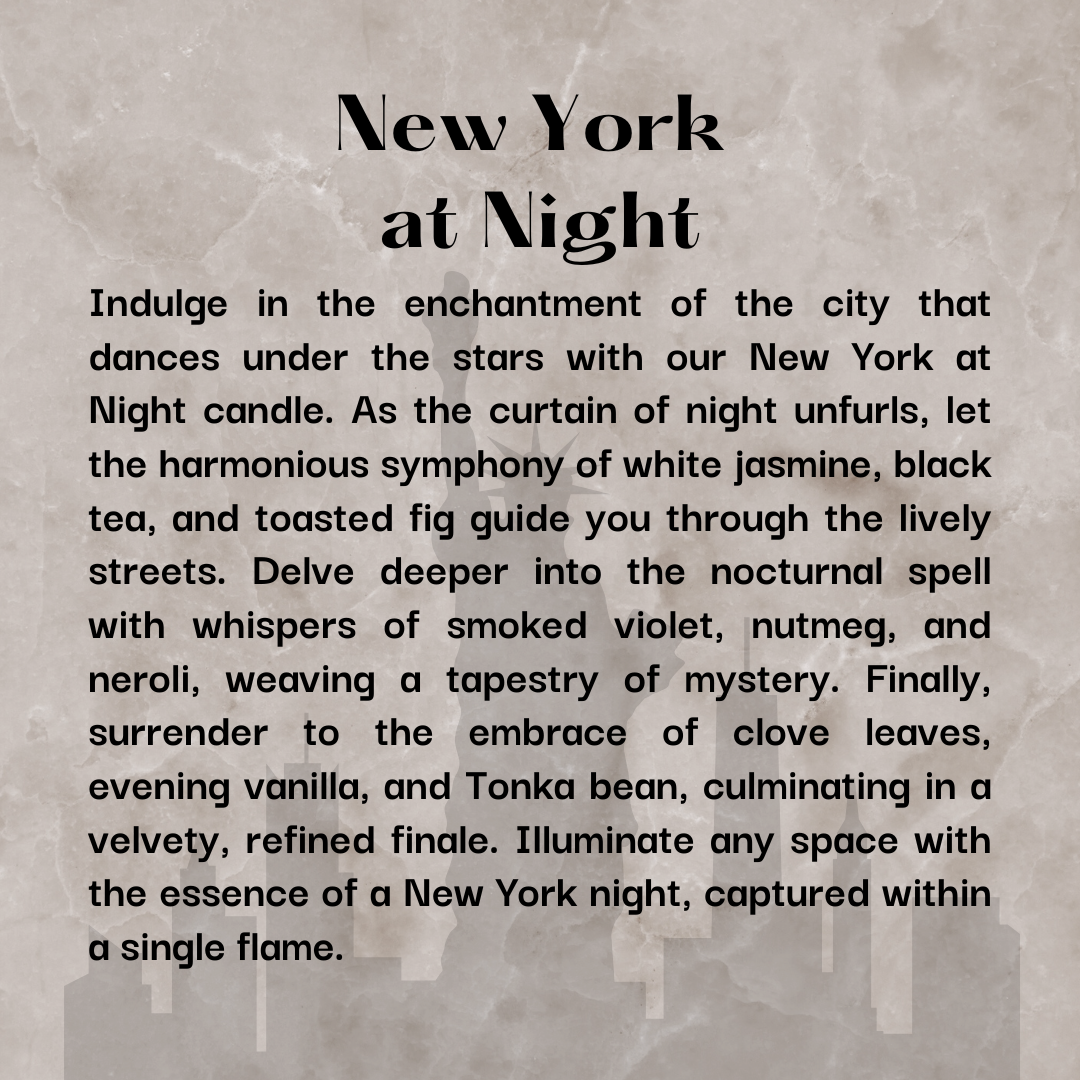 Indulge in the enchantment of the city that dances under the stars with our New York at Night candle. As the curtain of night unfurls, let the harmonious symphony of white jasmine, black tea, and toasted fig guide you through the lively streets. Delve deeper into the nocturnal spell with whispers of smoked violet, nutmeg, and neroli, weaving a tapestry of mystery. Finally, surrender to the embrace of clove leaves, evening vanilla, and Tonka bean, culminating in a velvety, refined finale. Illuminate any space with the essence of a New York night, captured within a single flame.