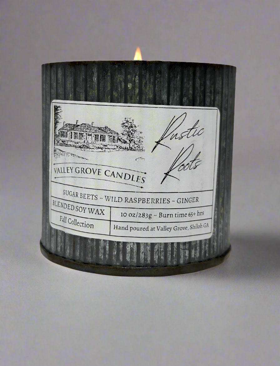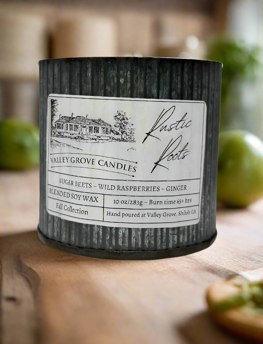 Hand-poured in a charming, corrugated tin, our Rustic Roots candle offers a herbaceous journey through a bountiful garden. Experience the essence of a cold-weather harvest, where fresh sugar beets, wild raspberries, and whole ginger beautifully intertwine with a subtle reminder of the cool, fertile soil they sprang from. A truly rustic and aromatic experience.