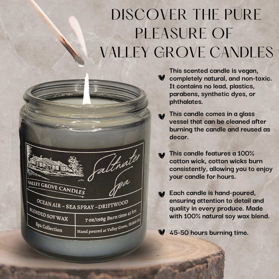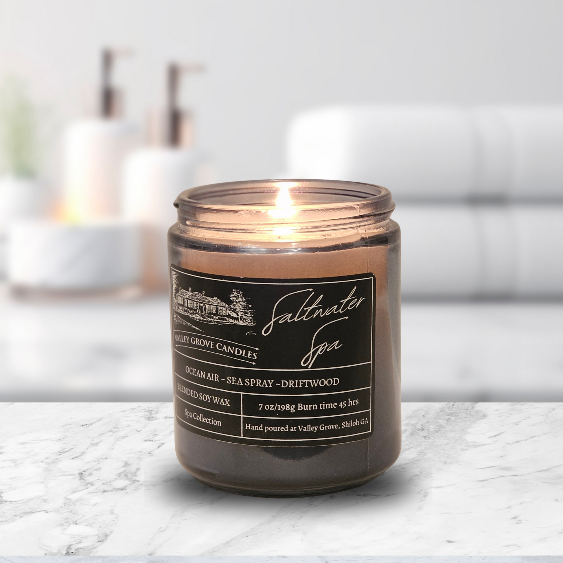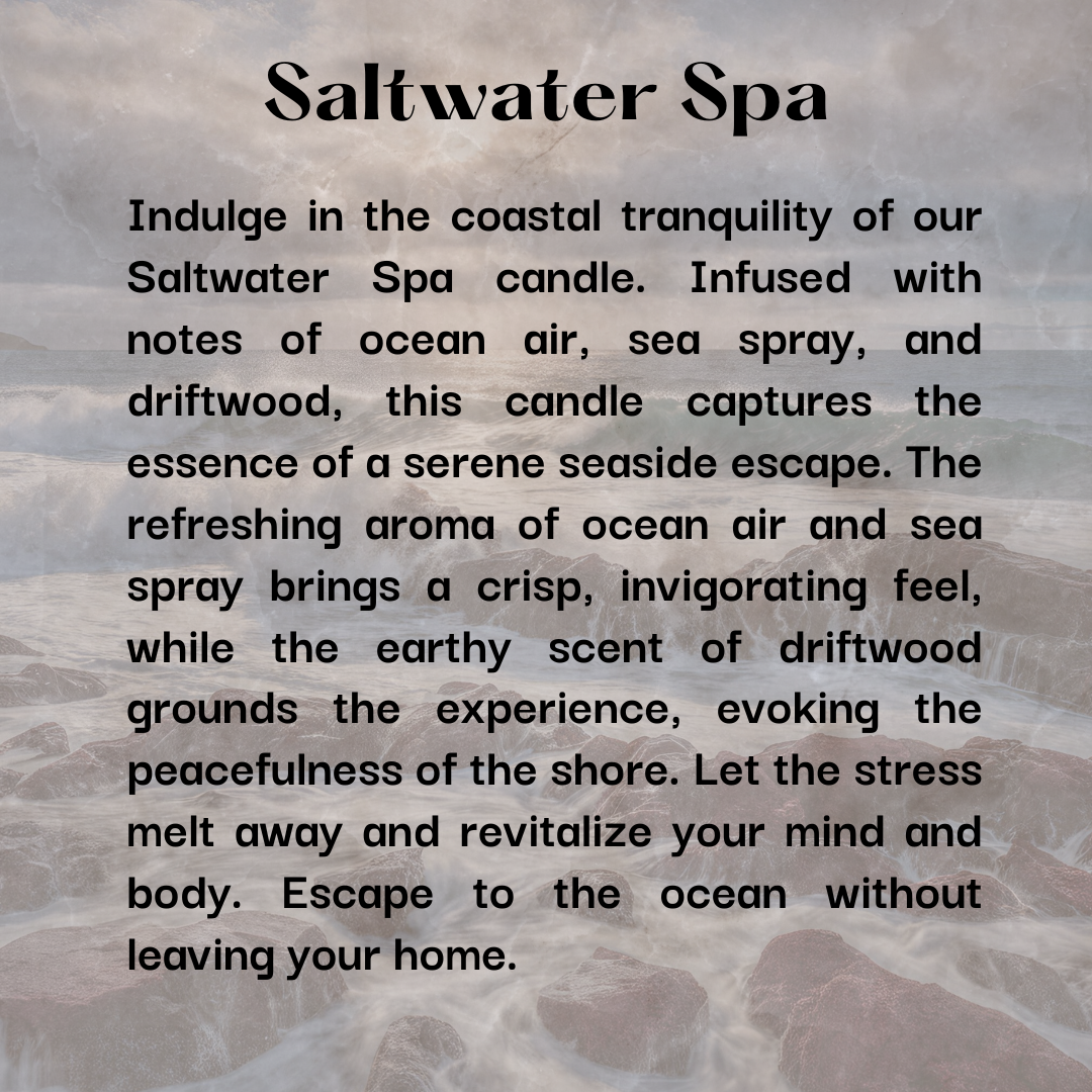Indulge in the coastal tranquility of our Saltwater Spa candle. Infused with notes of ocean air, sea spray, and driftwood, this candle captures the essence of a serene seaside escape. The refreshing aroma of ocean air and sea spray brings a crisp, invigorating feel, while the earthy scent of driftwood grounds the experience, evoking the peacefulness of the shore. Let the stress melt away and revitalize your mind and body. Escape to the ocean without leaving your home.