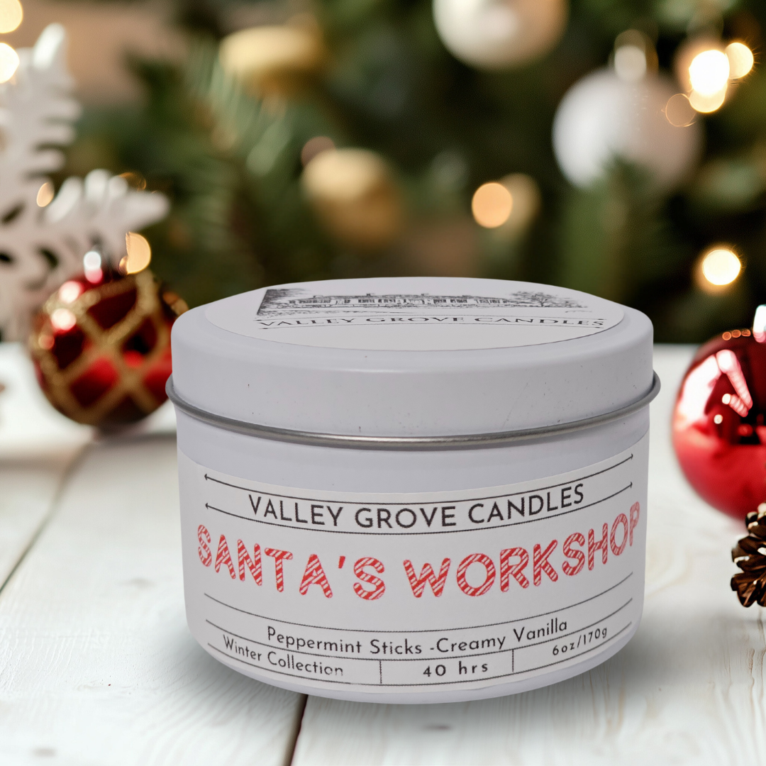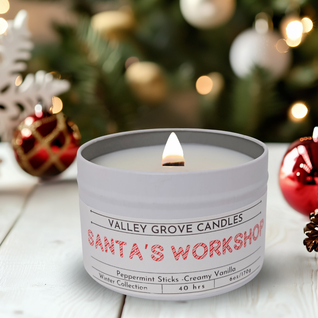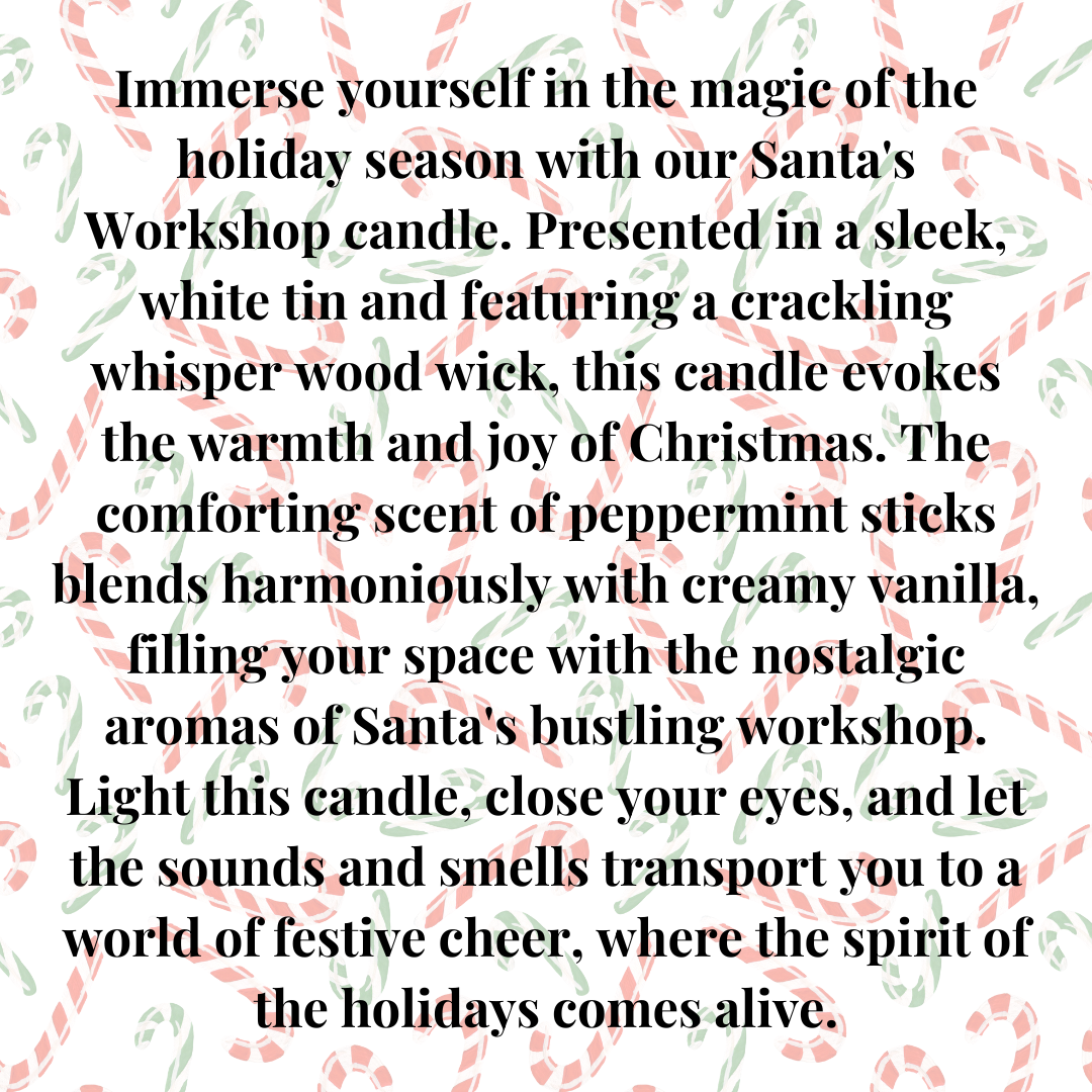 Immerse yourself in the magic of the holiday season with our Santa's Workshop candle. Presented in a sleek, white tin and featuring a crackling whisper wood wick, this candle evokes the warmth and joy of Christmas. The comforting scent of peppermint sticks blends harmoniously with creamy vanilla, filling your space with the nostalgic aromas of Santa's bustling workshop. Light this candle, close your eyes, and let the sounds and smells transport you to a world of festive cheer, where the spirit of the holidays comes alive.