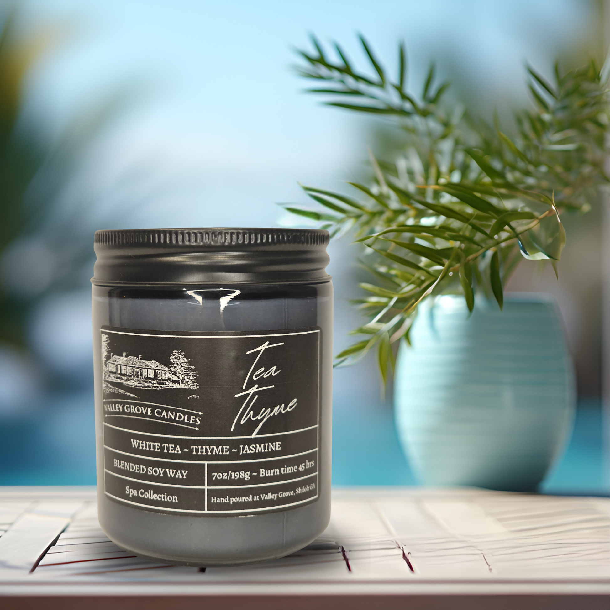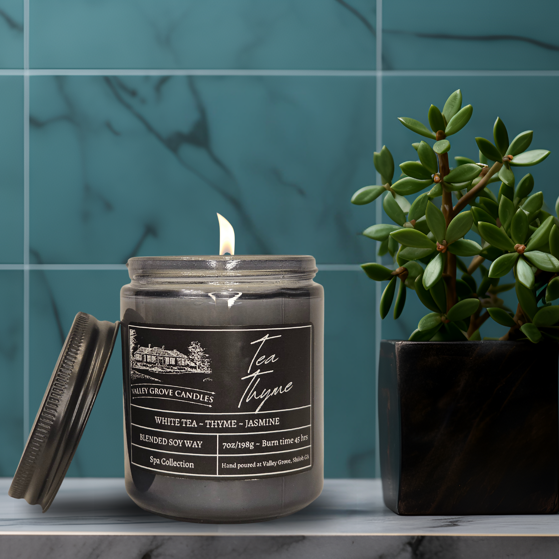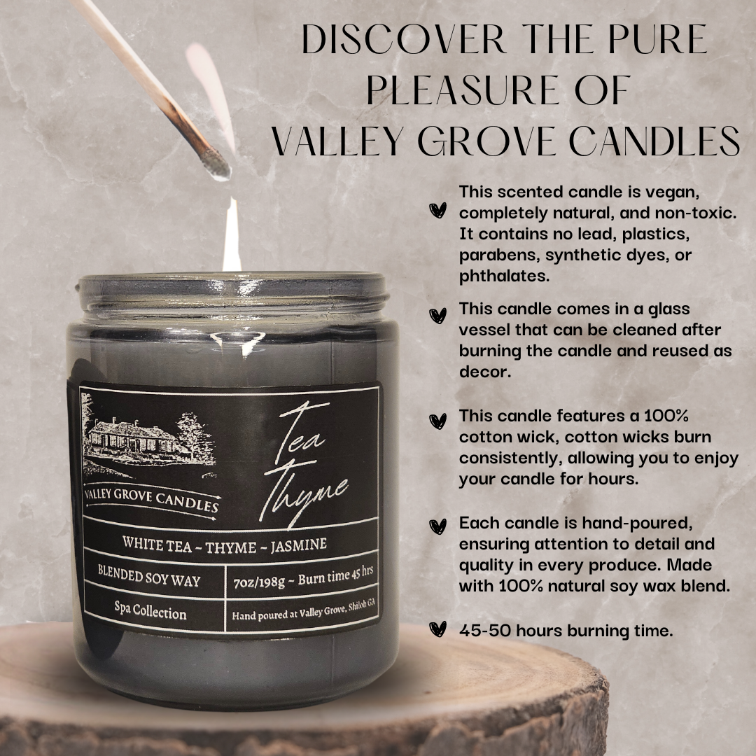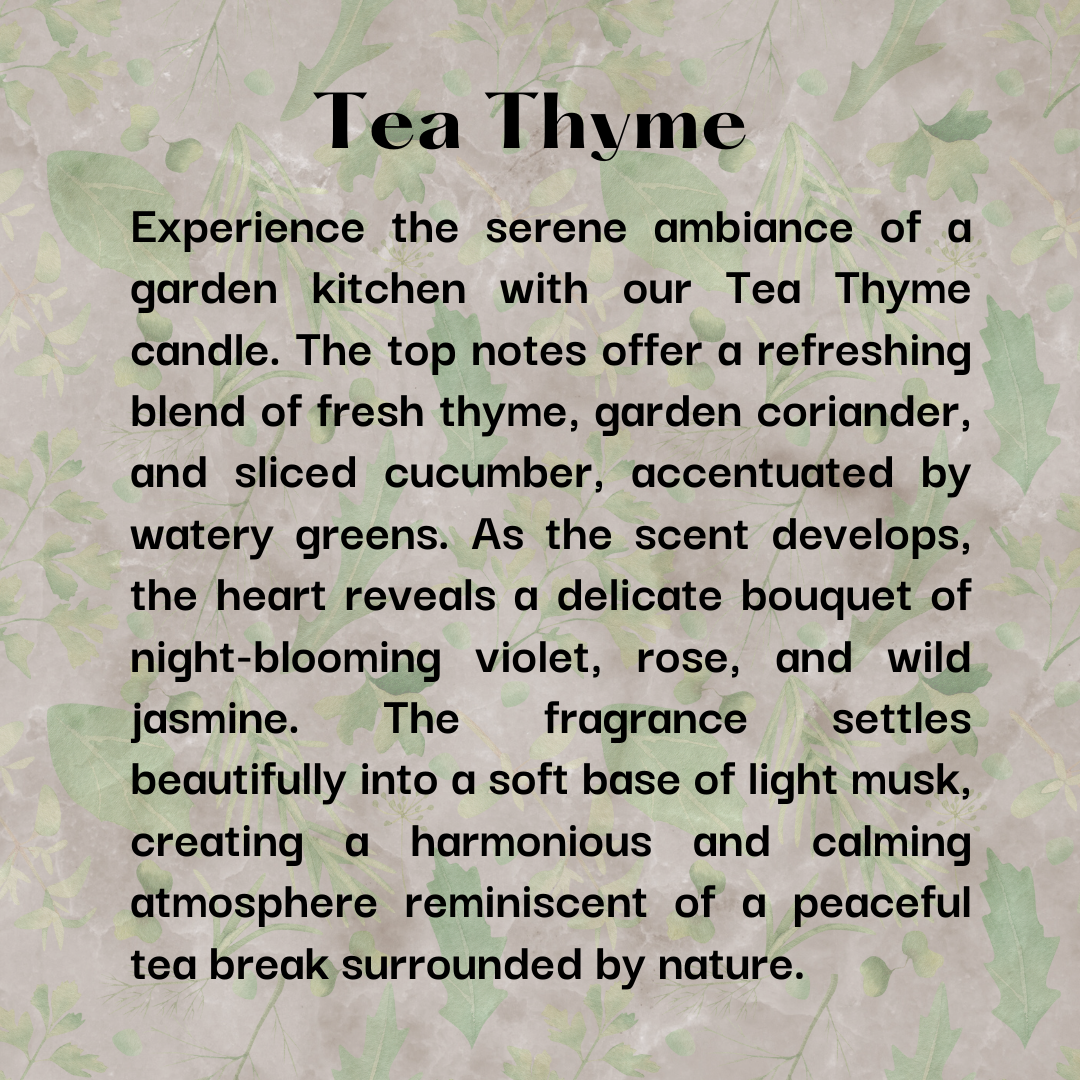 Experience the serene ambiance of a garden kitchen with our Tea Thyme candle. The top notes offer a refreshing blend of fresh thyme, garden coriander, and sliced cucumber, accentuated by watery greens. As the scent develops, the heart reveals a delicate bouquet of night-blooming violet, rose, and wild jasmine. The fragrance settles beautifully into a soft base of light musk, creating a harmonious and calming atmosphere reminiscent of a peaceful tea break surrounded by nature.