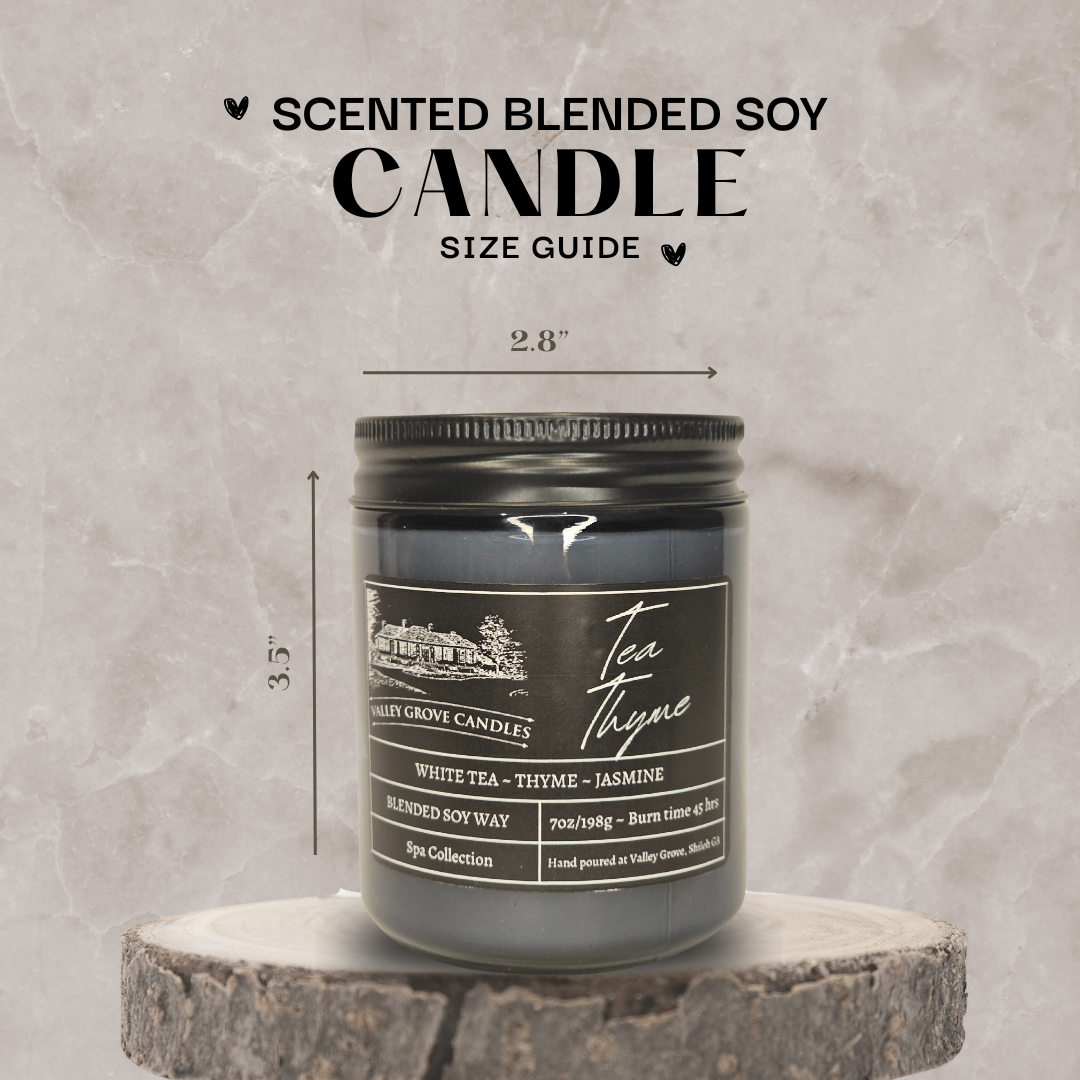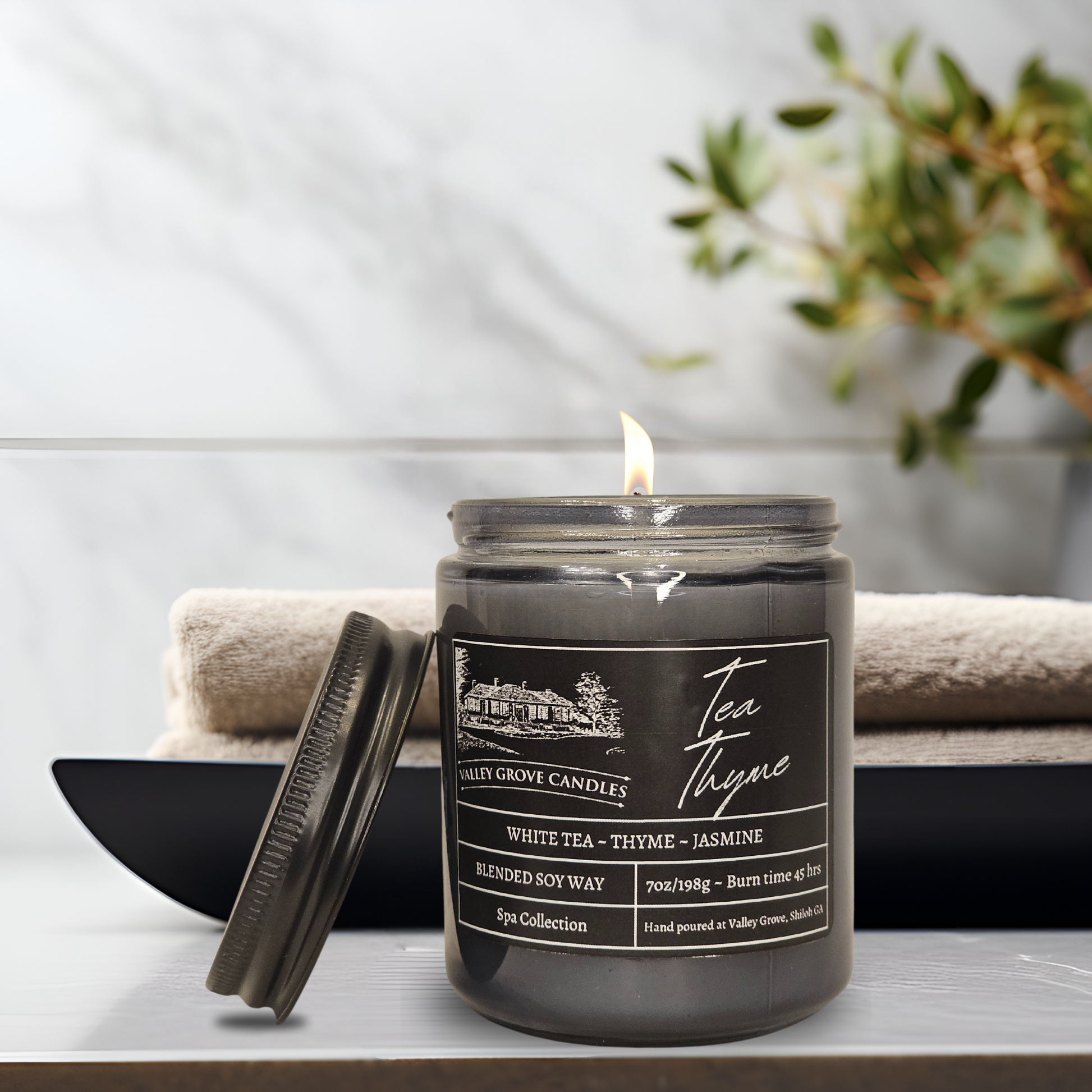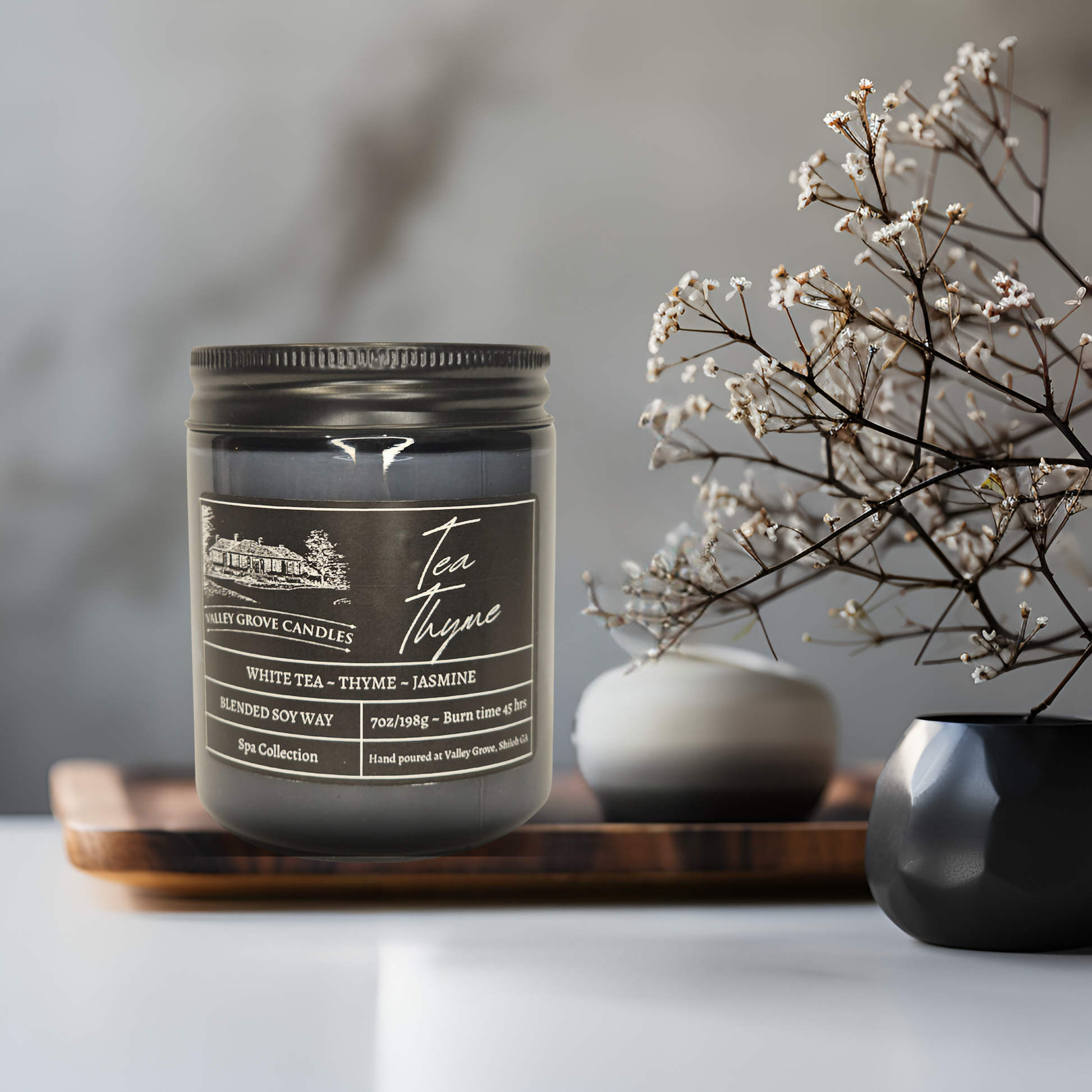 Experience the serene ambiance of a garden kitchen with our Tea Thyme candle. The top notes offer a refreshing blend of fresh thyme, garden coriander, and sliced cucumber, accentuated by watery greens. As the scent develops, the heart reveals a delicate bouquet of night-blooming violet, rose, and wild jasmine. The fragrance settles beautifully into a soft base of light musk, creating a harmonious and calming atmosphere reminiscent of a peaceful tea break surrounded by nature.