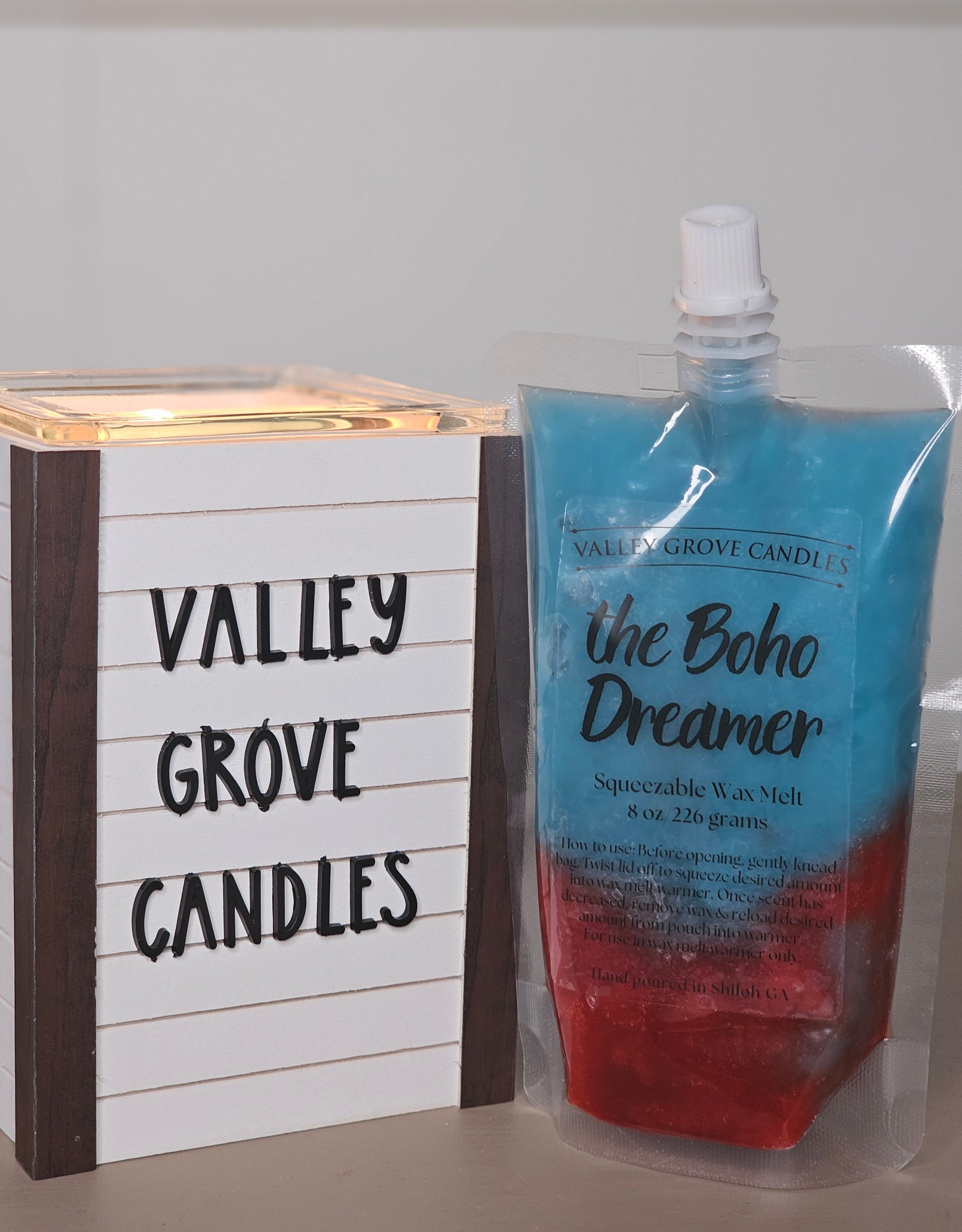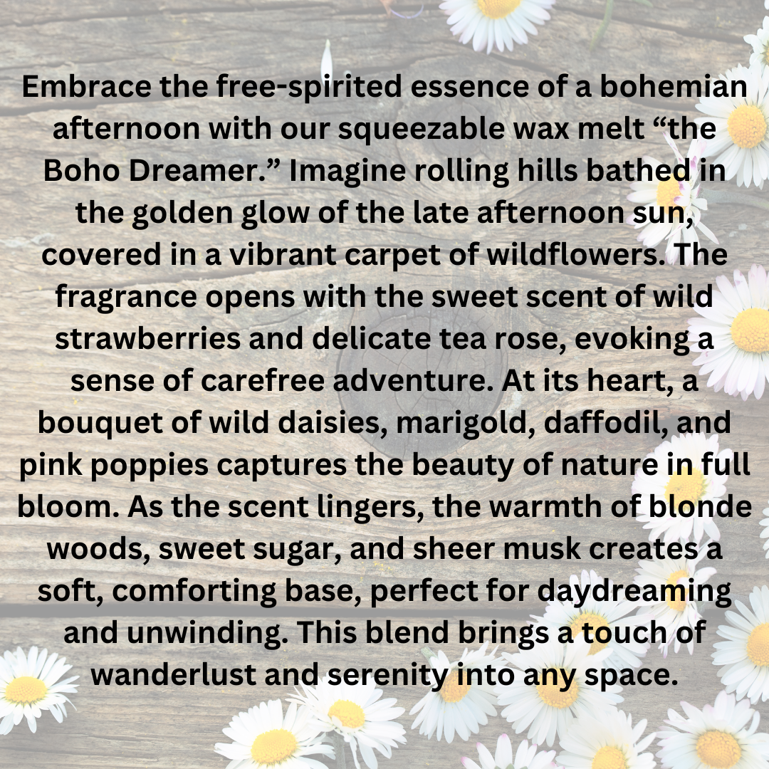 Embrace the free-spirited essence of a bohemian afternoon with our squeezable wax melt “the Boho Dreamer.” Imagine rolling hills bathed in the golden glow of the late afternoon sun, covered in a vibrant carpet of wildflowers. The fragrance opens with the sweet scent of wild strawberries and delicate tea rose, evoking a sense of carefree adventure. At its heart, a bouquet of wild daisies, marigold, daffodil, and pink poppies captures the beauty of nature in full bloom. As the scent lingers, the warmth of blonde woods, sweet sugar, and sheer musk creates a soft, comforting base, perfect for daydreaming and unwinding. This blend brings a touch of wanderlust and serenity into any space.