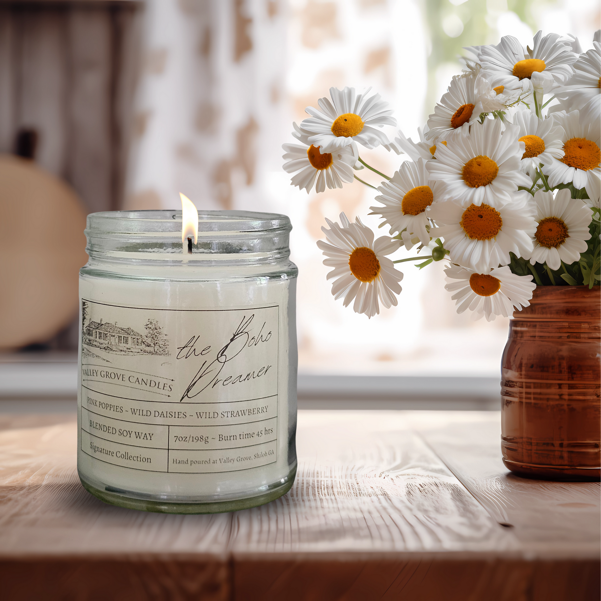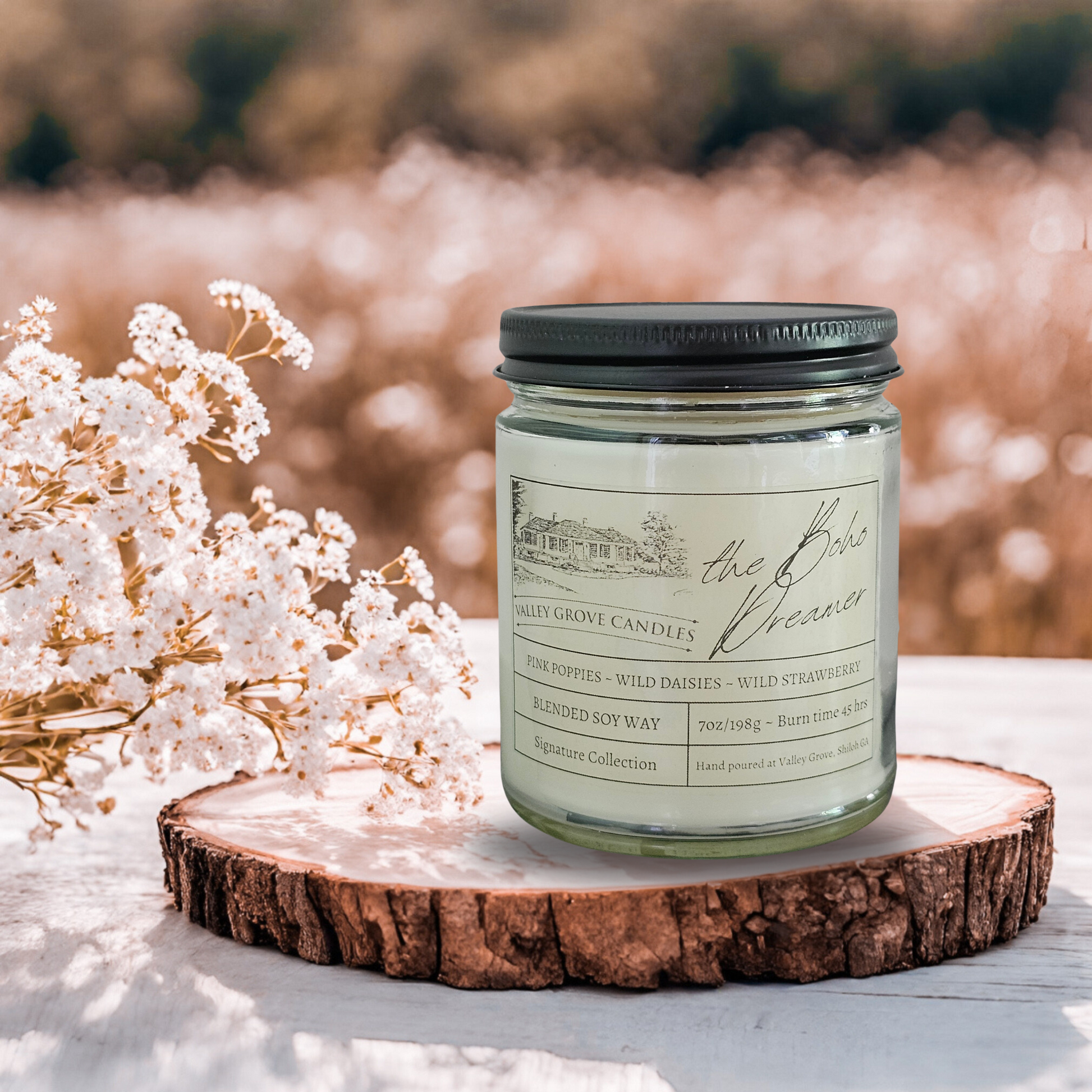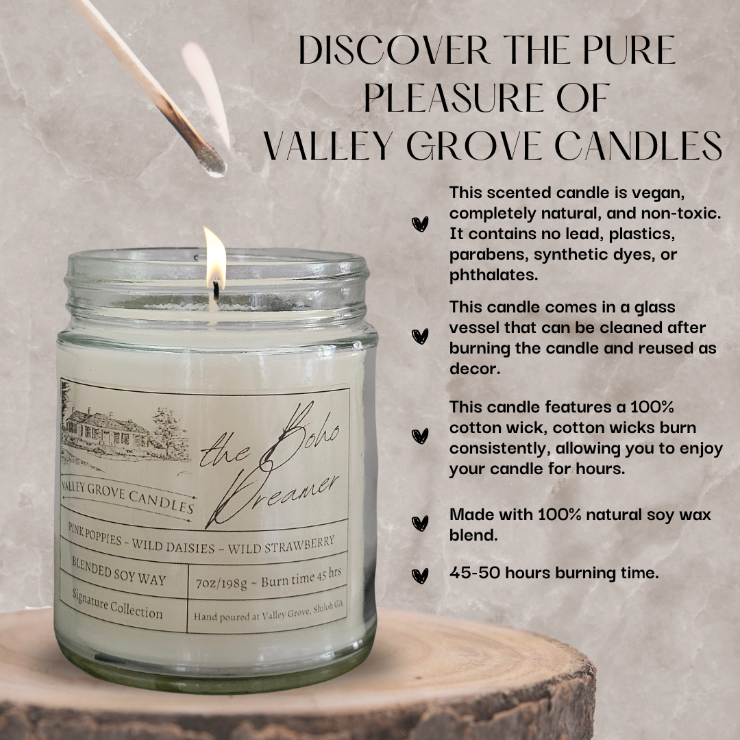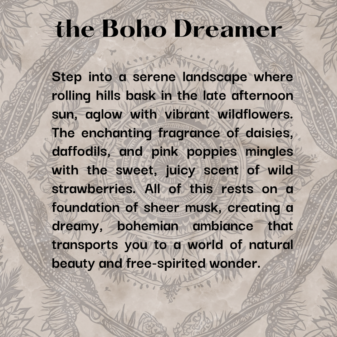 Step into a serene landscape where rolling hills bask in the late afternoon sun, aglow with vibrant wildflowers. The enchanting fragrance of daisies, daffodils, and pink poppies mingles with the sweet, juicy scent of wild strawberries. All of this rests on a foundation of sheer musk, creating a dreamy, bohemian ambiance that transports you to a world of natural beauty and free-spirited wonder.