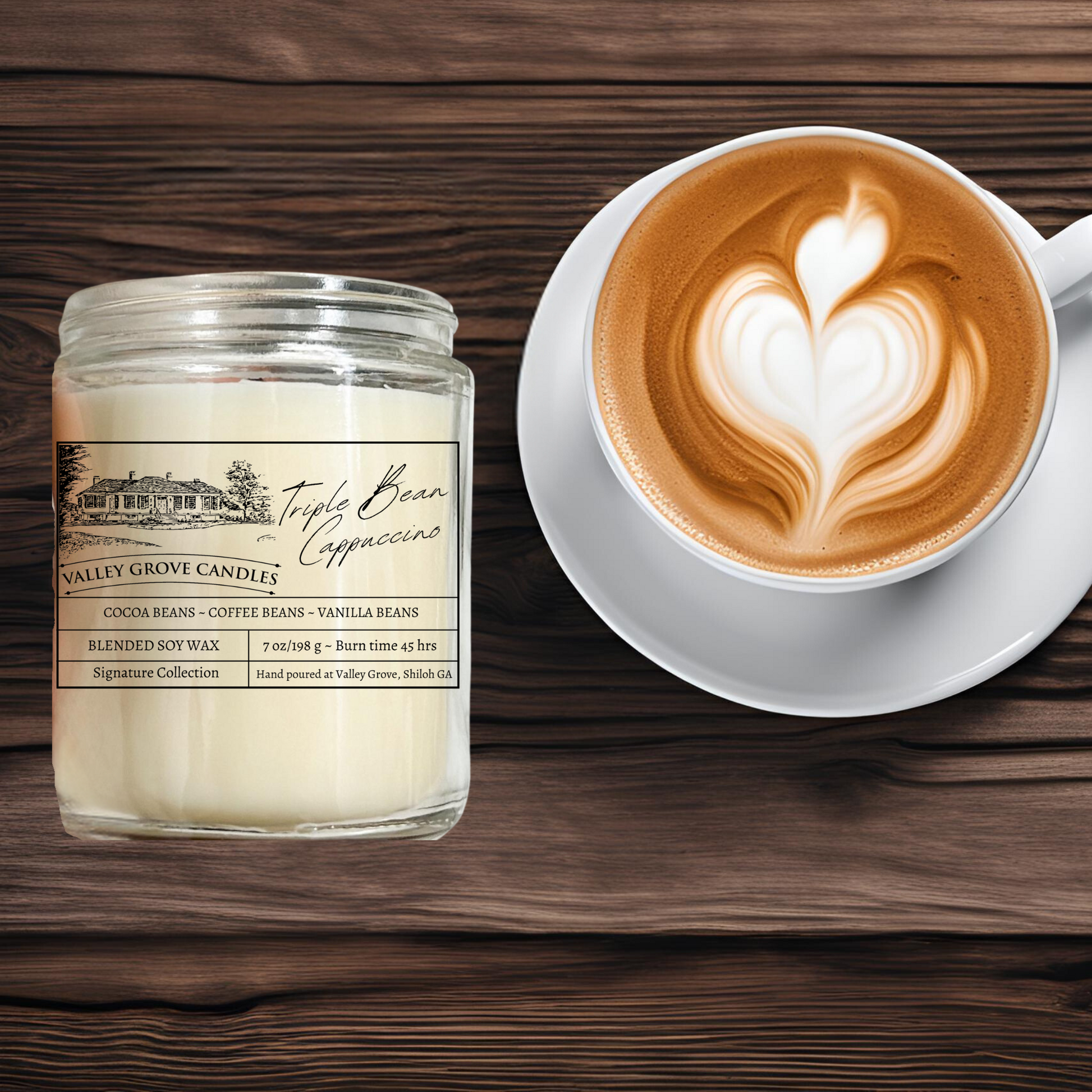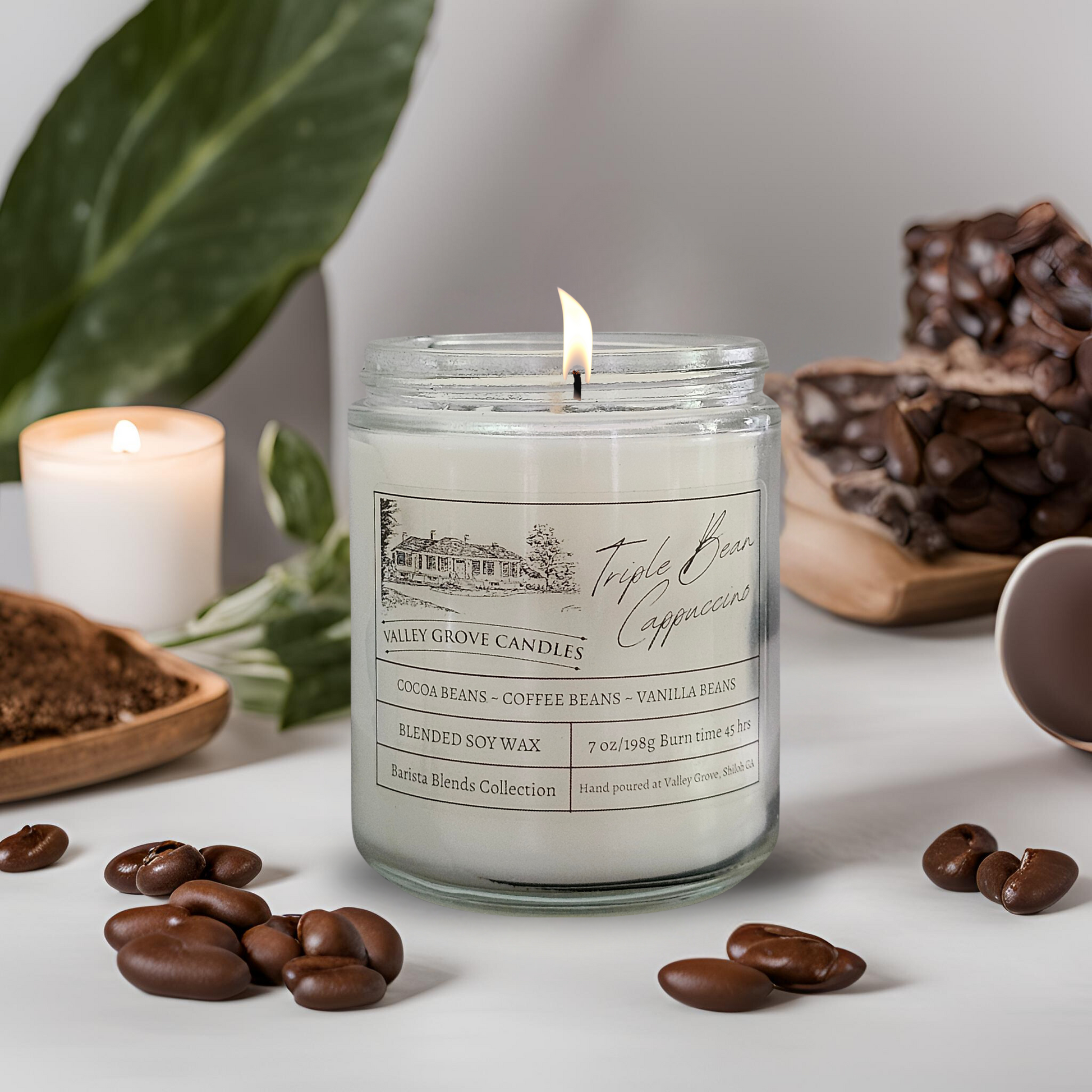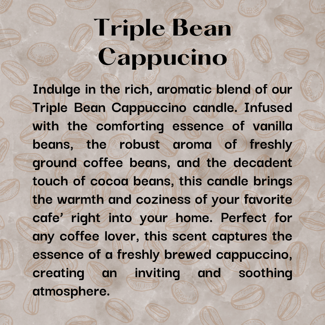 Indulge in the rich, aromatic blend of our Triple Bean Cappuccino candle. Infused with the comforting essence of vanilla beans, the robust aroma of freshly ground coffee beans, and the decadent touch of cocoa beans, this candle brings the warmth and coziness of your favorite cafe’ right into your home. Perfect for any coffee lover, this scent captures the essence of a freshly brewed cappuccino, creating an inviting and soothing atmosphere.
