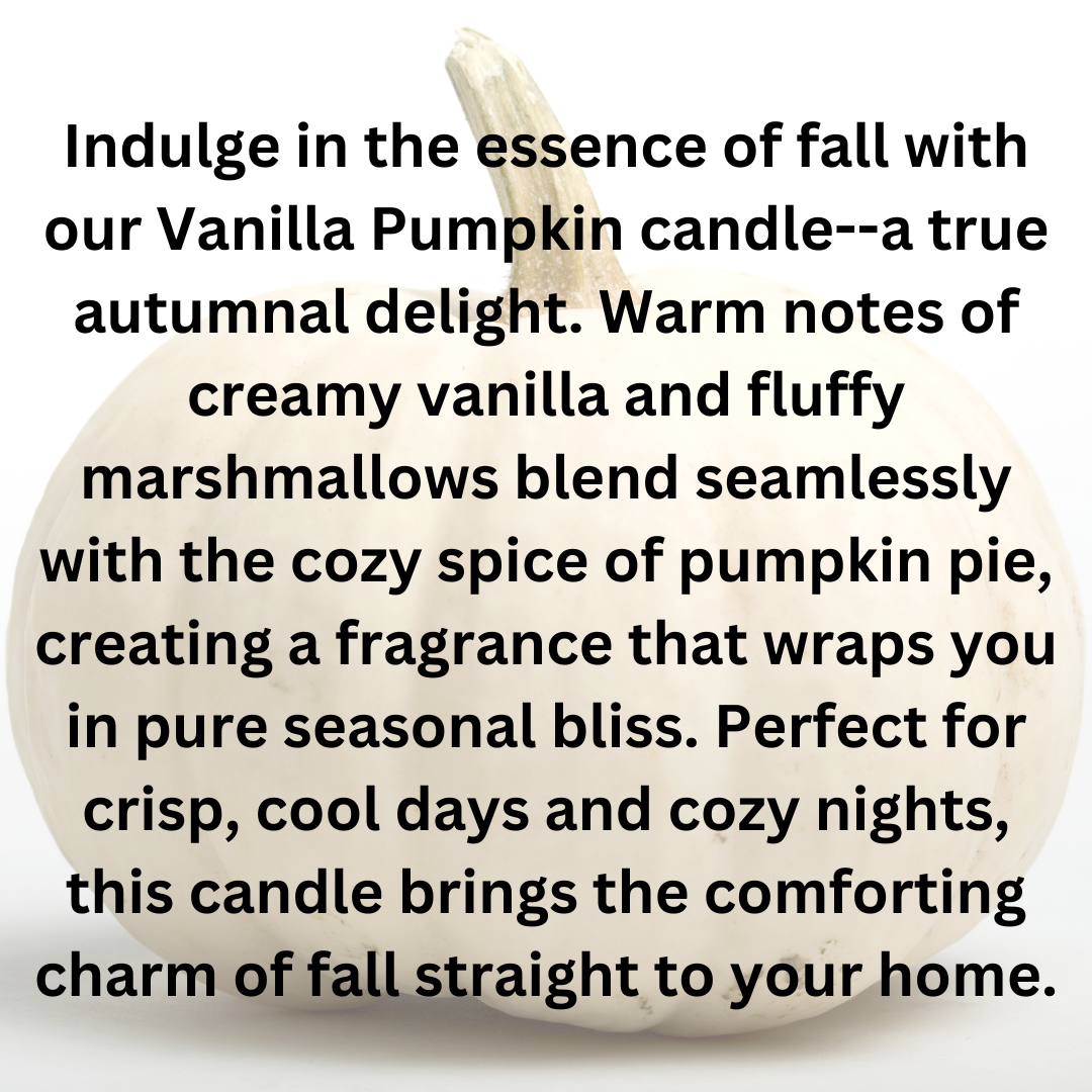 Indulge in the essence of fall with our Vanilla Pumpkin candle--a true autumnal delight. Warm notes of creamy vanilla and fluffy marshmallows blend seamlessly with the cozy spice of pumpkin pie, creating a fragrance that wraps you in pure seasonal bliss. Perfect for crisp, cool days and cozy nights, this candle brings the comforting charm of fall straight to your home.