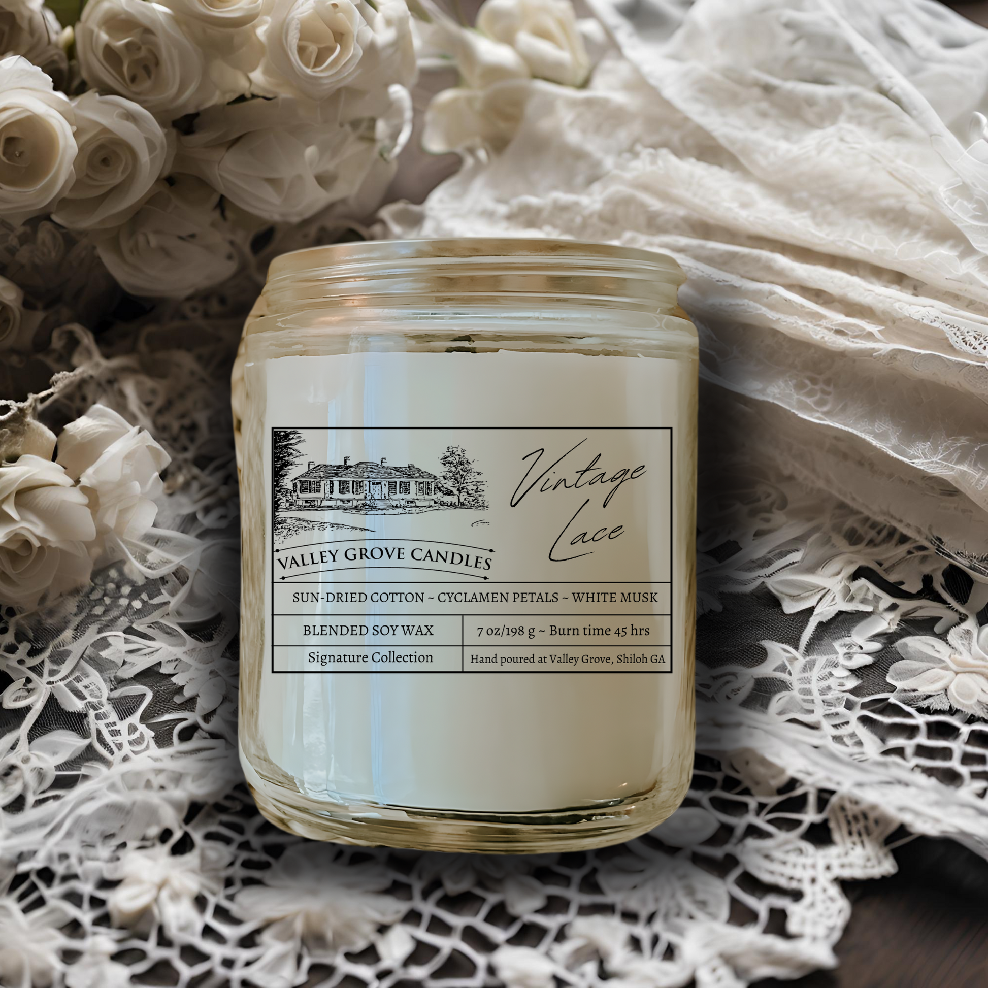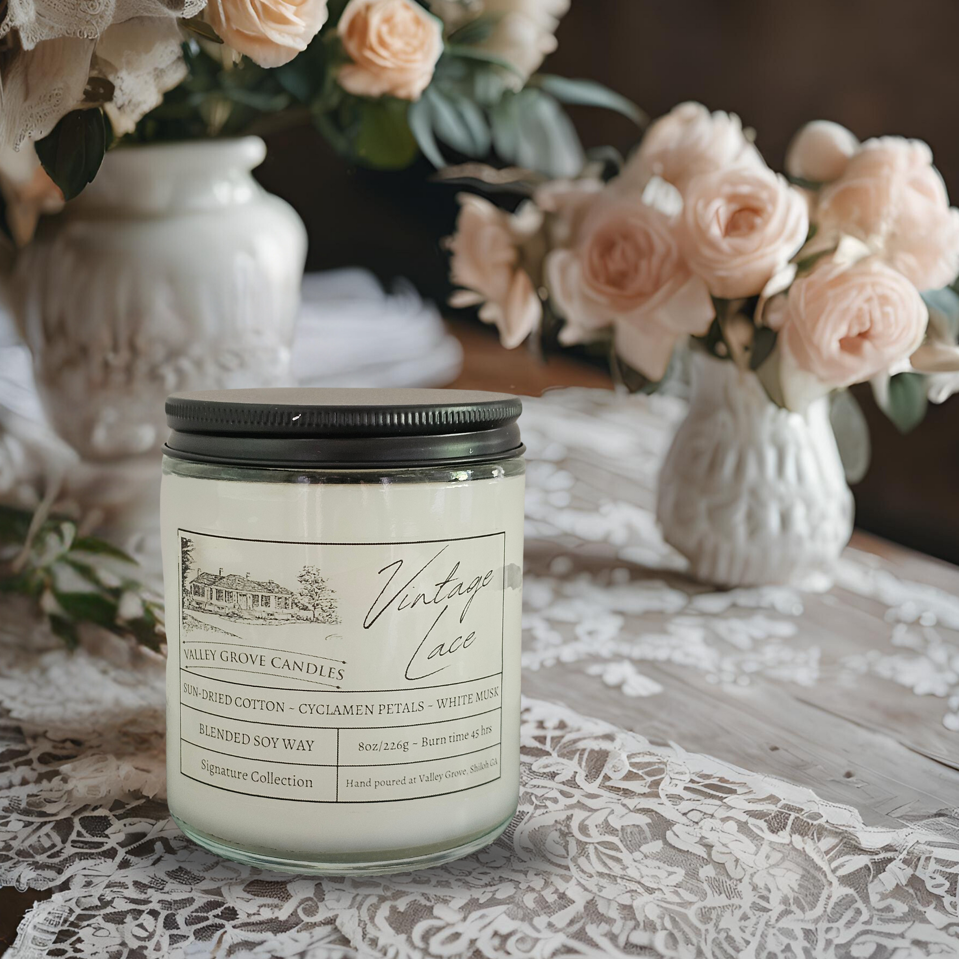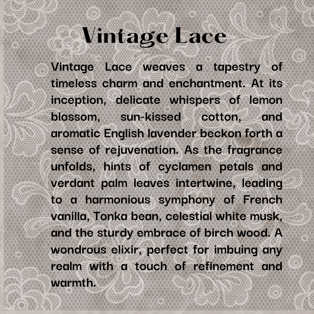 Vintage Lace weaves a tapestry of timeless charm and enchantment. At its inception, delicate whispers of lemon blossom, sun-kissed cotton, and aromatic English lavender beckon forth a sense of rejuvenation. As the fragrance unfolds, hints of cyclamen petals and verdant palm leaves intertwine, leading to a harmonious symphony of French vanilla, Tonka bean, celestial white musk, and the sturdy embrace of birch wood. A wondrous elixir, perfect for imbuing any realm with a touch of refinement and warmth.