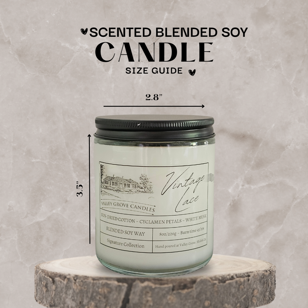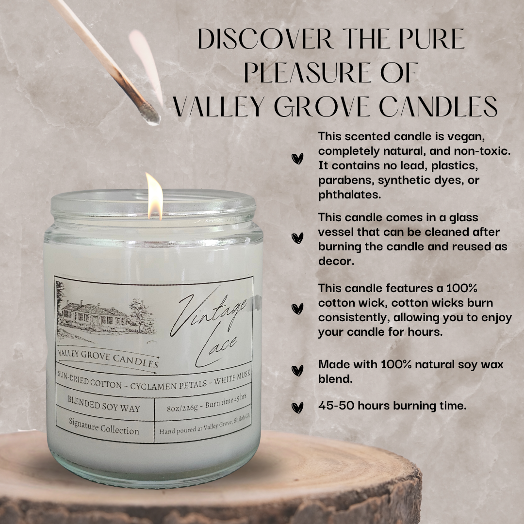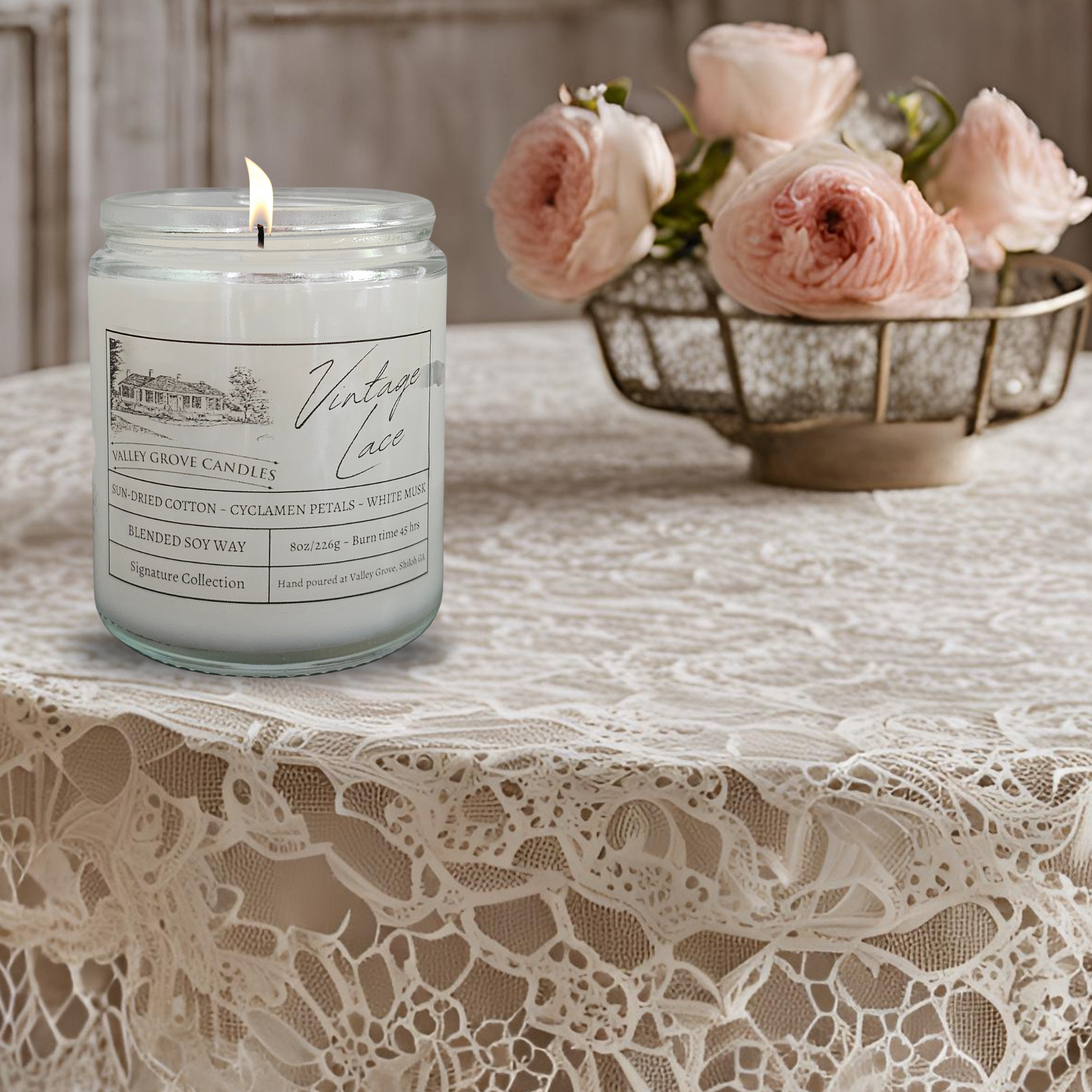 Vintage Lace weaves a tapestry of timeless charm and enchantment. At its inception, delicate whispers of lemon blossom, sun-kissed cotton, and aromatic English lavender beckon forth a sense of rejuvenation. As the fragrance unfolds, hints of cyclamen petals and verdant palm leaves intertwine, leading to a harmonious symphony of French vanilla, Tonka bean, celestial white musk, and the sturdy embrace of birch wood. A wondrous elixir, perfect for imbuing any realm with a touch of refinement and warmth.